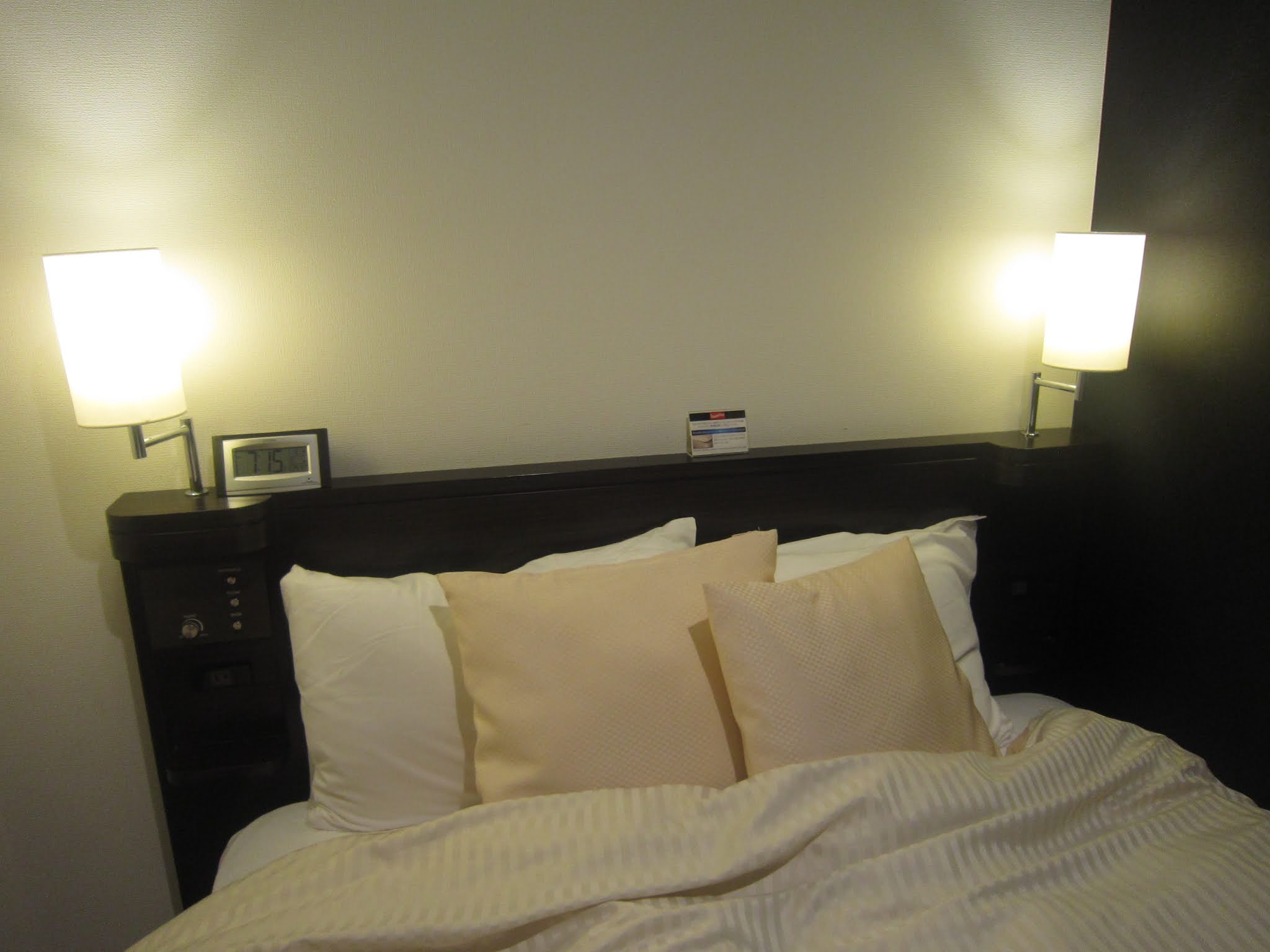 視線拉回房間內側,雙人床與其上的寢具觸感相當柔細蓬鬆,睡起來很令人滿意。床頭板上放了床墊的品牌介紹,使人感受到旅館對床鋪品質的自信。