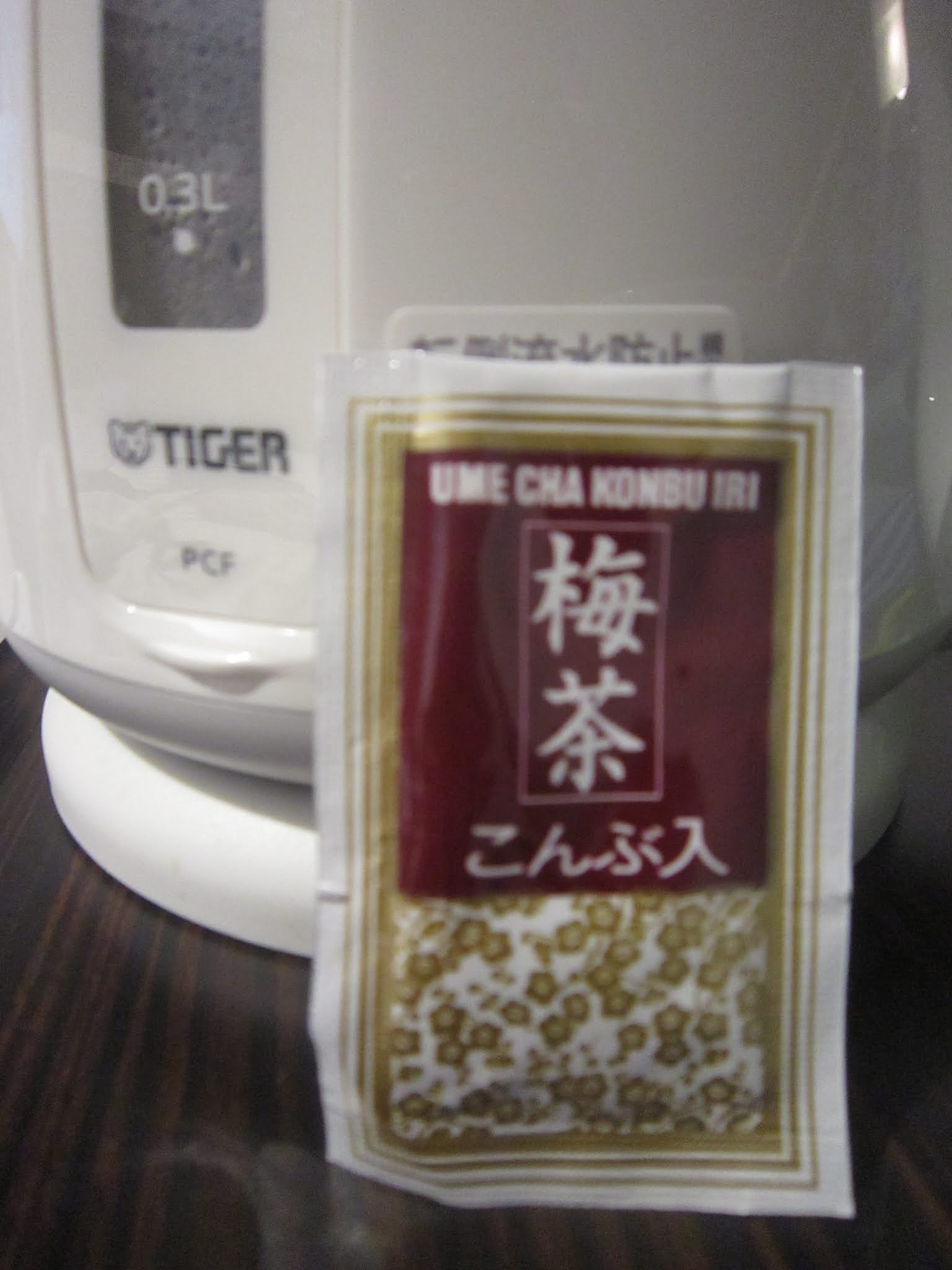 面床的工作檯面下有小冰箱及電熱水壺、面紙盒、茶包等,昆布梅茶真好喝。