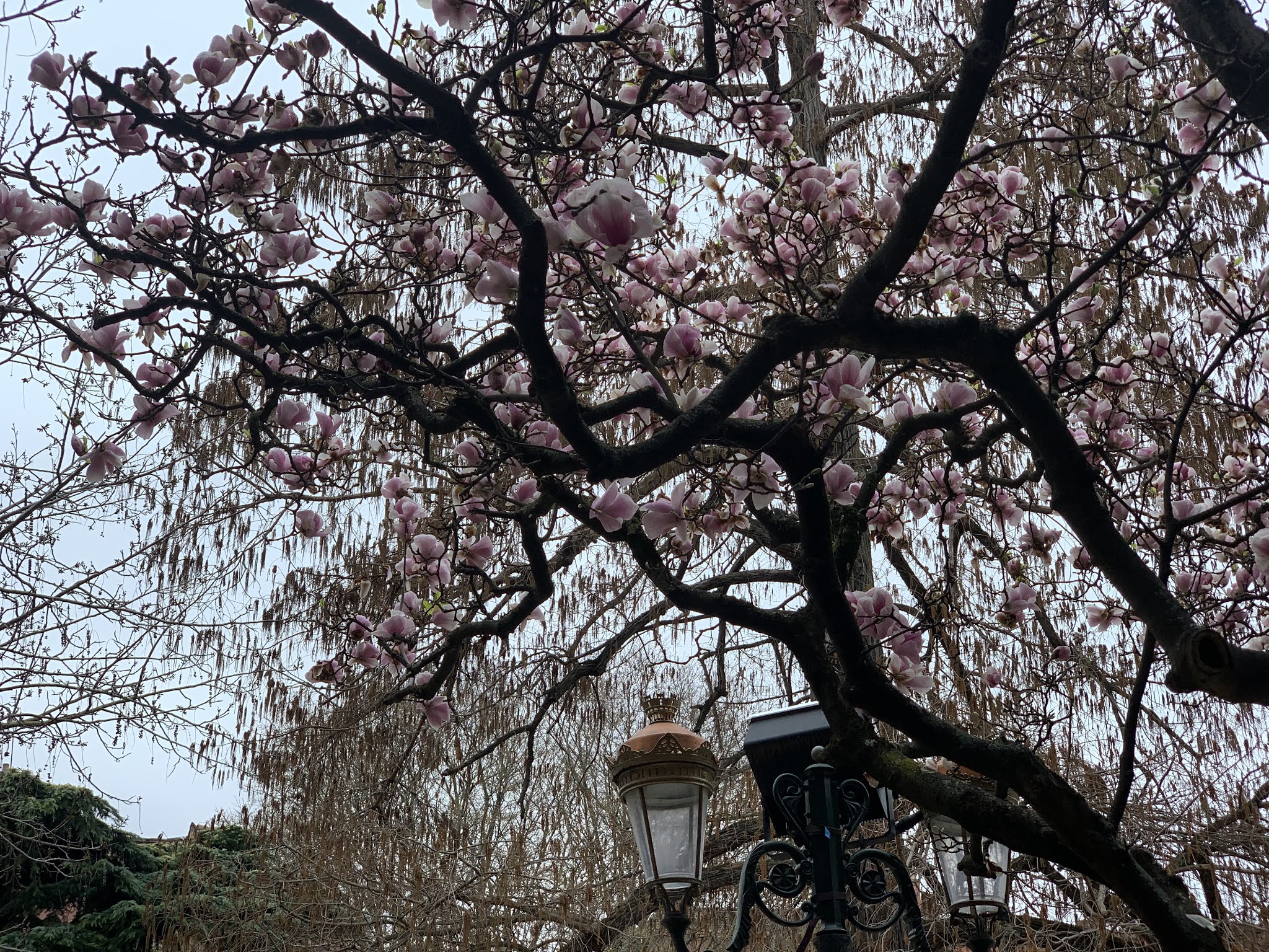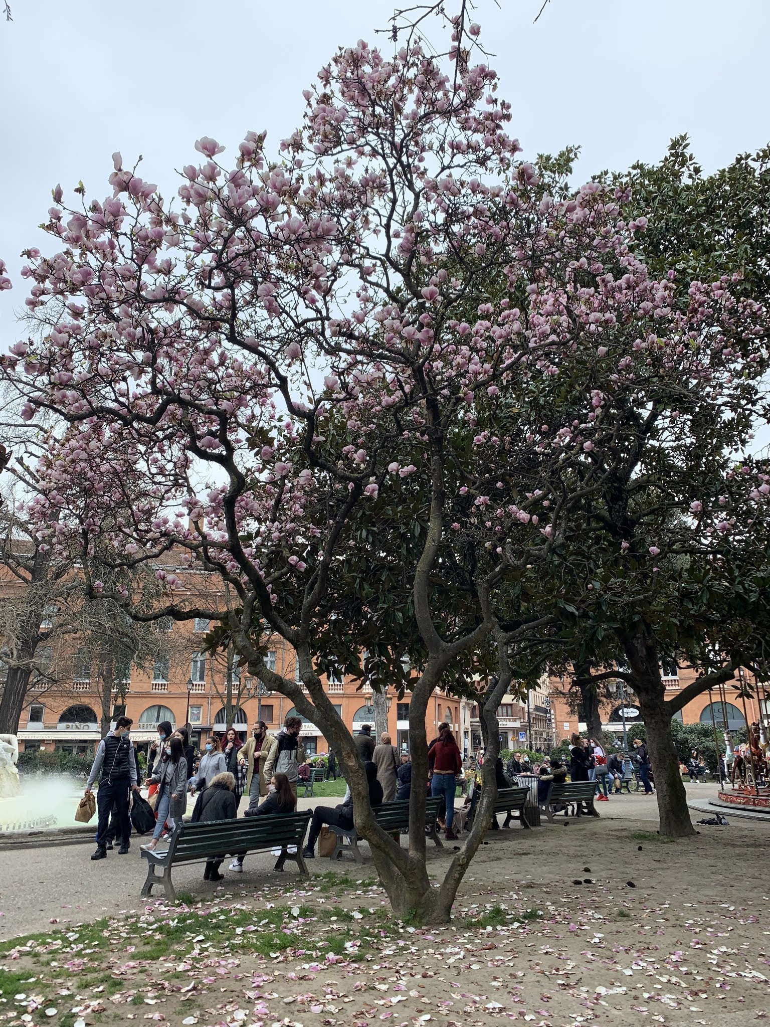 此時的Jardin Raymond VI春色無邊,高處有白色與粉色花樹盛放,腳邊的草地上遍開紫色風信子與黃色白色的花,人們則在花園的各個角落交誼、嬉戲。