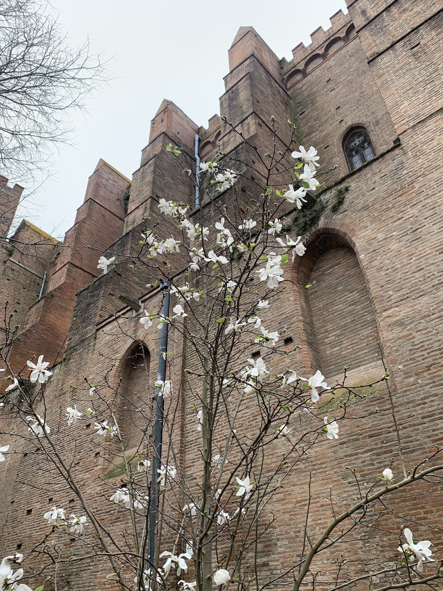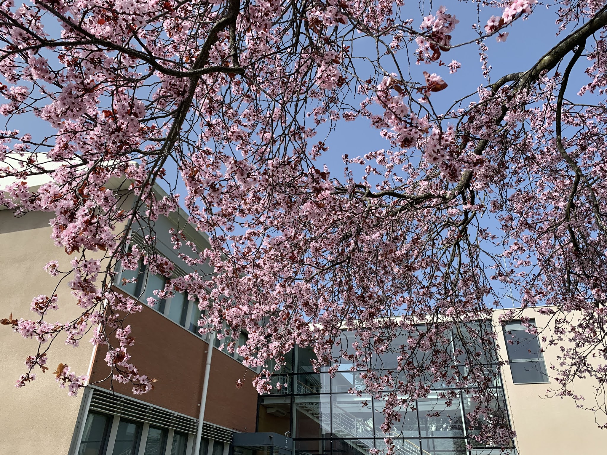 回程依然一路賞花,校內Y棟與M棟之間停車場一隅的兩層樓高粉紅櫻花樹開得正好。