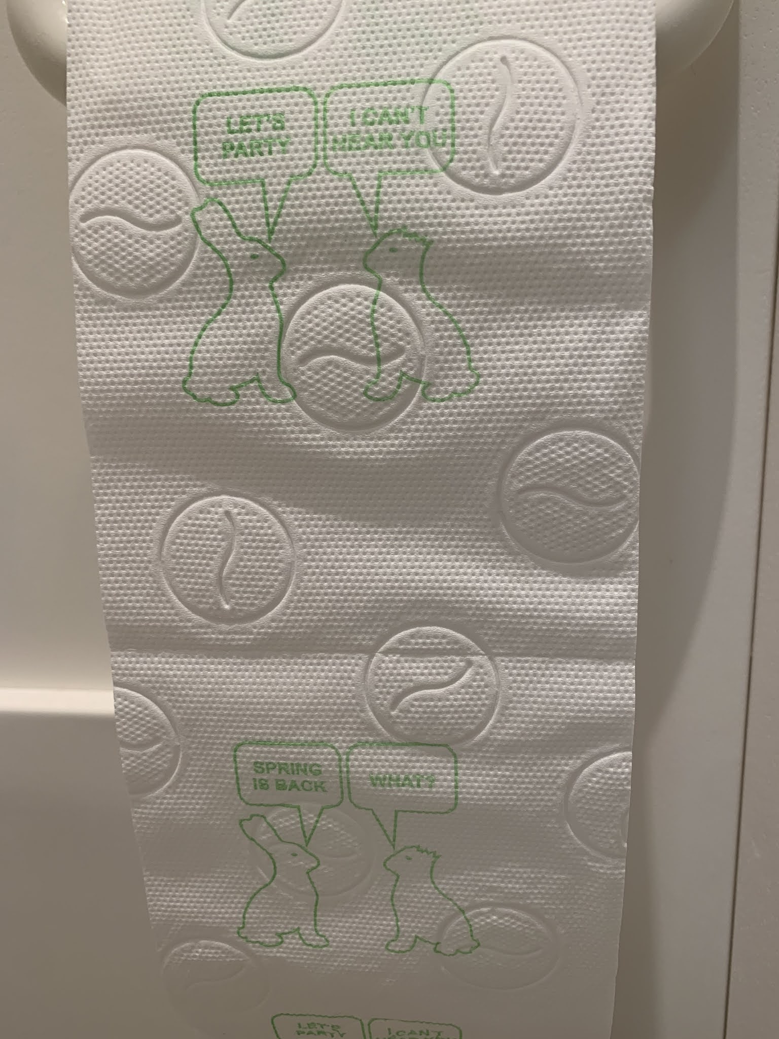 這次買的衛生紙共九卷,每卷圖案各異,而這卷的圖案──長耳兔與無耳兔的對話──是目前唯一讓我放下「想拍但有點懶」念頭,立刻拍照留念的。
