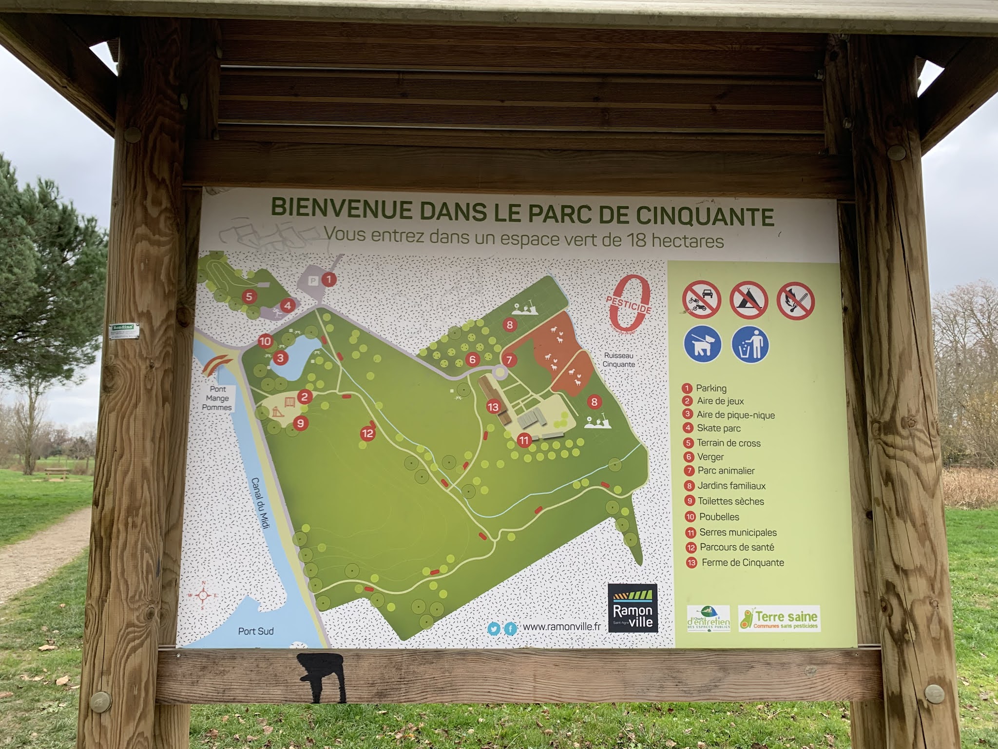 這次走到 Pont de Mange Pommes後第一次拐進旁邊的Parc de Cinquante,是個有大片綠地以及些許遊樂與健身器材的郊區公園。之前幾次經過裡頭都充滿兒童的歡笑聲,但今天沒有半個家庭帶小孩來玩耍,只看到一兩個人在遠方慢跑,及在公園入口外的溜冰區看到一位白髮男士顫巍巍地練習溜著我心有好感的直排輪,非常勵志,學習永不嫌晚。